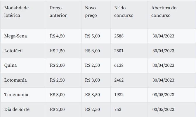 Para a Mega-Sena, a Lotofácil, a Quina e a Lotomania, os novos preços valerão a partir de 30 de abril. Para o Timemania e o Dia de Sorte, o aumento entrará em vigor em 3 de maio. De acordo com a Caixa, o reajuste foi necessário para repor a inflação acumulada desde novembro de 2019, quando ocorreu o último aumento.