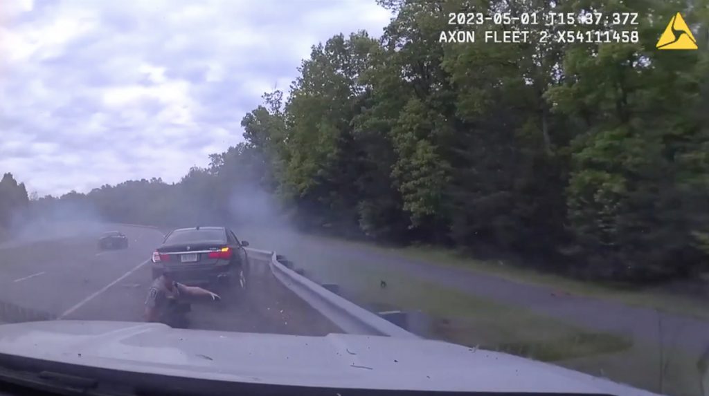 Vídeo mostra que, por sorte, o policial conseguiu desviar de uma BMW M3 descontrolada. Veículo girou em sua direção enquanto ele falava com o motorista de outro carro, no acostamento de uma estrada em Fairfax, na Virgínia.