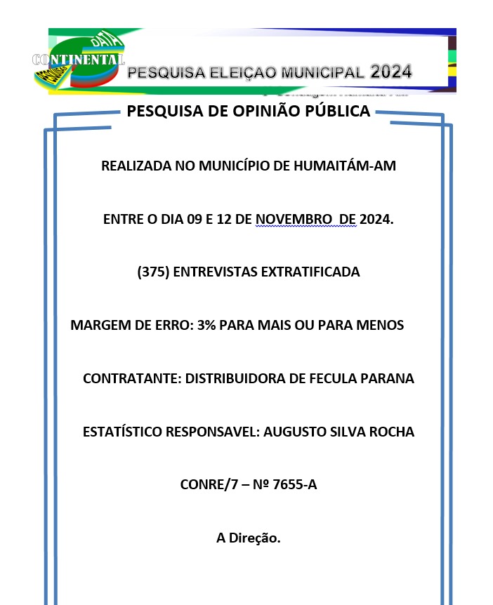 O Instituto de Pesquisa Data Continental divulgou os resultados da 3ª pesquisa eleitoral municipal realizada em Humaitá-AM entre os dias 09 a 12 de novembro de 2023. A pesquisa teve como objetivo avaliar o cenário político e as intenções de voto para a eleição municipal de 2024. Confira os principais resultados: