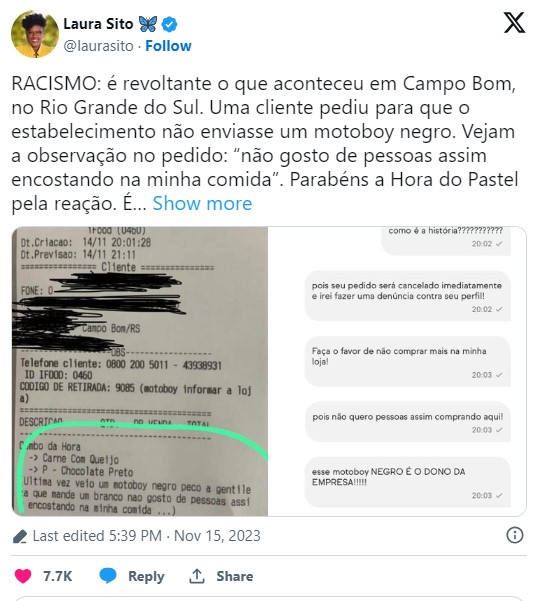 Uma pastelaria em Campo Bom, no Rio Grande do Sul, denunciou um incidente de racismo ocorrido durante um pedido feito por uma cliente na noite nesta semana.
