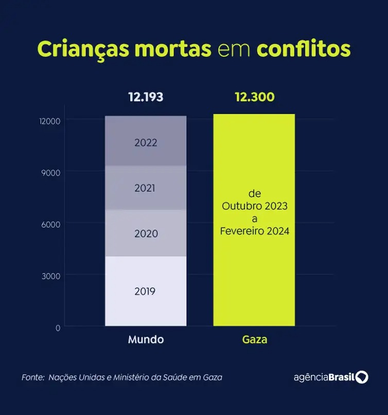 O número de crianças mortas na Faixa de Gaza em 4 meses de guerra, de outubro de 2023 a fevereiro de 2024, superou o total de crianças mortas em todas as guerras do mundo durante 4 anos, de 2019 a 2022. Os números foram compilados pela Organização das Nações Unidas (ONU), que calcula que uma criança é morta a cada 10 minutos em Gaza.