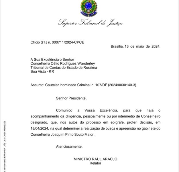 A PF cumpriu mandados de busca e apreensão no gabinete funcional de Joaquim Souto Maior, ouvidor do Tribunal de Contas do Estado de Roraima (TCE/RR), e na casa de um juiz do Tribunal da Justiça do Estado de Roraima (TJ/RR).