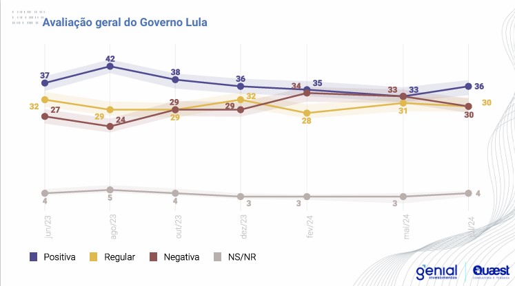 A nova pesquisa Genial/Quaest divulgada nesta quarta-feira, 10, aponta crescimento na avaliação positiva do governo Luiz Inácio Lula da Silva (PT). O trabalho do presidente é aprovado por 54% dos eleitores e reprovado por 43%. Os que avaliam como negativa caiu para 30%.
