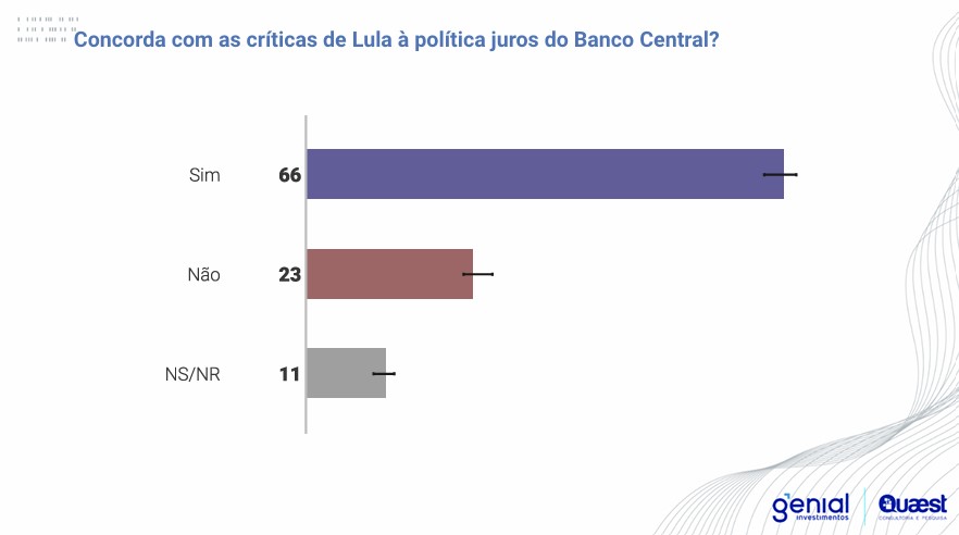 A maioria (66%) concorda com as críticas do presidente Lula. Porém, 53% acham que Campos Neto tende a usar critérios técnicos na condução do Banco Central.
