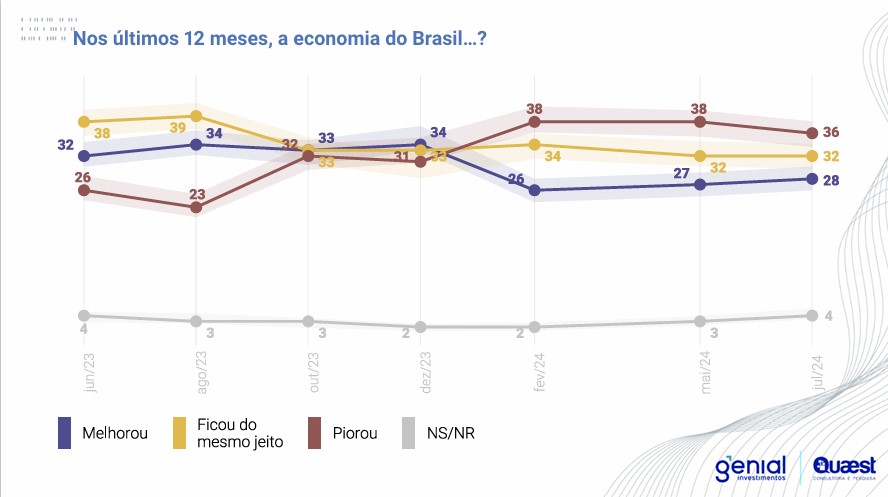 Os entrevistados foram perguntados sobre a economia. Para 36% a situação econômica piorou nos últimos 12 meses, já 28% acreditam que melhorou.
