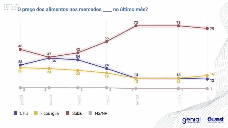 O preço dos alimentos no mercado está sendo sentido no bolso dos brasileiros. 70% avaliam que subiu no último mês. Apenas 12% avaliam que caiu.