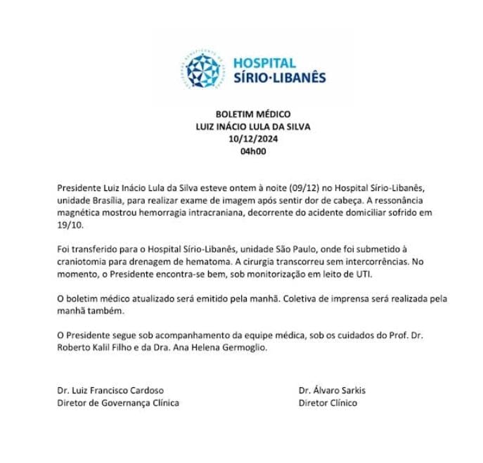Segundo boletim divulgado pelo hospital, Lula esteve ontem à noite na unidade de Brasília do Sírio-Libanês, para exame de imagem, após sentir dor de cabeça. A ressonância magnética mostrou hemorragia intracraniana, decorrente do acidente domiciliar sofrido em 19 de outubro. O presidente foi transferido para a unidade do hospital, em São Paulo, onde passou pelo procedimento cirúrgico.