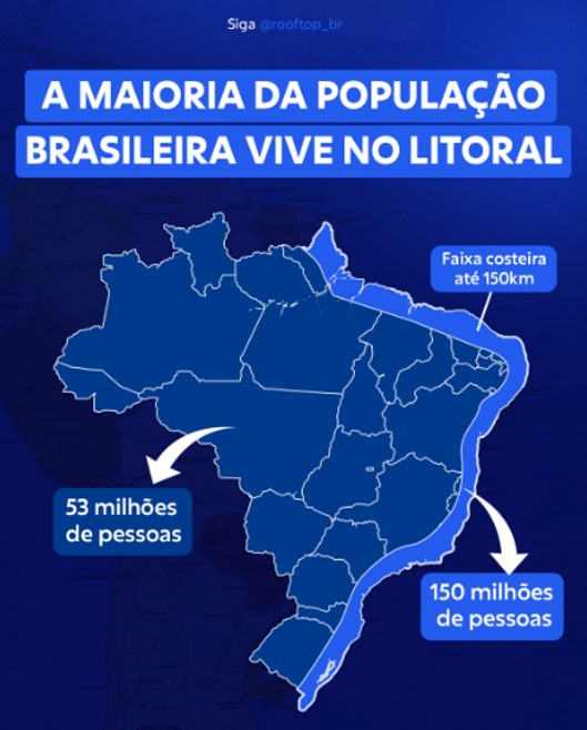 Um levantamento mostra que 74% da população brasileira vive a até 150 quilômetros do litoral — o equivalente a quase 150 milhões de pessoas concentradas em uma estreita faixa costeira que se estende do Oiapoque ao Chuí.