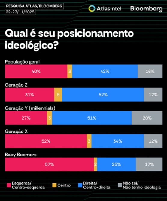 Um levantamento Atlas divulgado pela Bloomberg aponta uma mudança significativa no mapa ideológico brasileiro quando comparadas diferentes gerações. Enquanto os grupos mais velhos se identificam majoritariamente com posições de esquerda, os mais jovens tendem a se alinhar à direita.