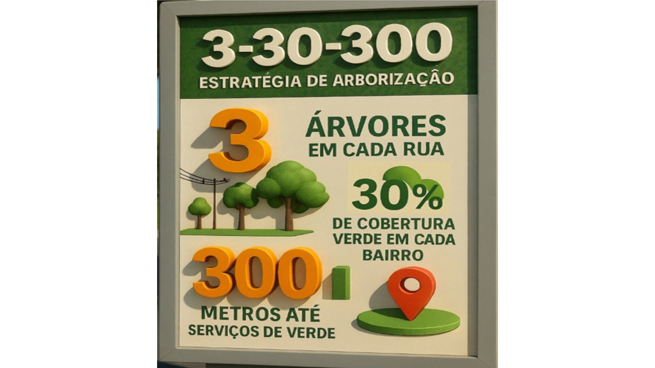 No coração do plano está o protocolo 3–30–300, referência global adotada por cidades sustentáveis ao redor do mundo: