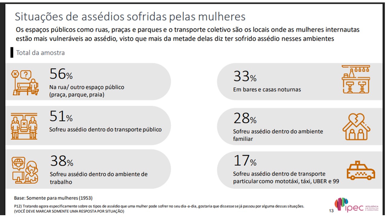 Segundo a pesquisa, 56% relatam ter sido assediadas em espaços públicos. O transporte coletivo aparece em seguida, com 51% das entrevistadas dizendo ter sofrido assédio dentro de ônibus, trens ou metrôs. O ambiente de trabalho foi citado por 38% e bares e casas noturnas por 33%. Já 28% afirmam ter vivenciado situações de assédio no ambiente familiar, enquanto 17% mencionam ocorrências em transporte particular, como mototáxi, táxi e aplicativos.