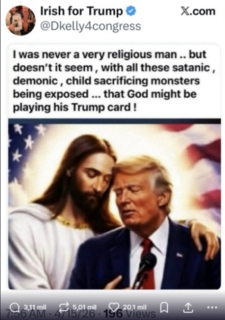 A legenda do postagem traz uma ironia com o nome de Trump e uma expressão em inglês: “Eu nunca fui um homem muito religioso… mas não parece que, com todos esses monstros satânicos, demoníacos e que sacrificam crianças sendo expostos… Deus pode estar jogando sua ‘Trump card’”.