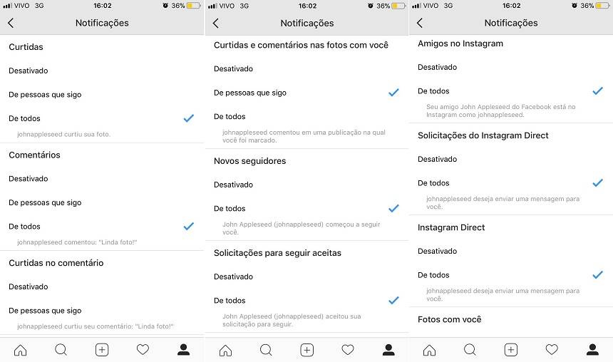 *Agora, você pode configurar quais notificações você quer receber. Entre as opções estão curtidas, comentários, curtidas em comentários, marcações, curtidas e comentários de fotos nas quais você está marcado, novos seguidores, confirmações de convites, quando um amigo do Facebook está no Instagram, mensagens diretas, contagem de vídeos, pedidos de suporte, entre outros;