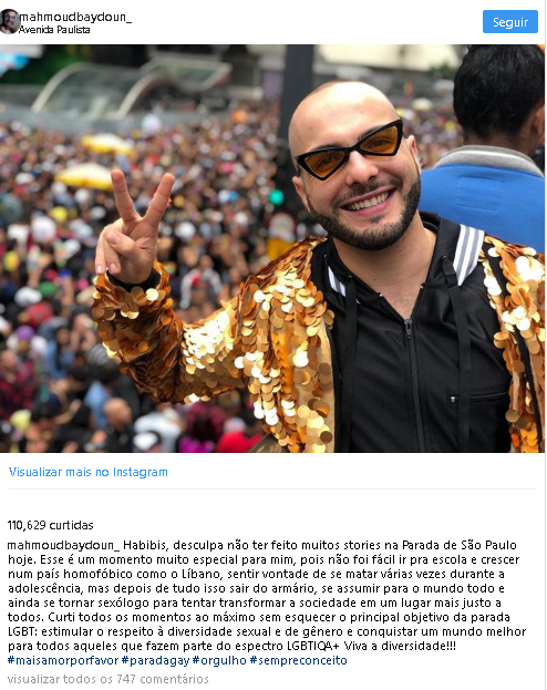 Mahmoud curtiu a Parada Gay, ocorrida no domingo (3/6), em São Paulo, mas não compartilhou com os fãs momentos do evento. Porém, para esclarecer a ausência de imagens e vídeos, o sírio foi às redes sociais falar sobre homofobia.