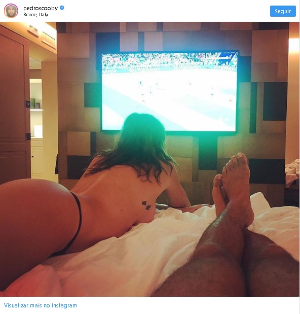 Um dos casais famosos mais polêmicos nas redes sociais, Pedro Scooby e Luana Piovani não escondem a intimidade. A atriz aparece com frequência no Instagram do marido usando lingerie, nua ou seminua. Nesta quarta-feira (27), o surfista mostrou mais um momento íntimo entre eles, ao postar uma foto em que ele assistia ao jogo do Brasil de uma forma inusitada: com a esposa usando apenas calcinha.