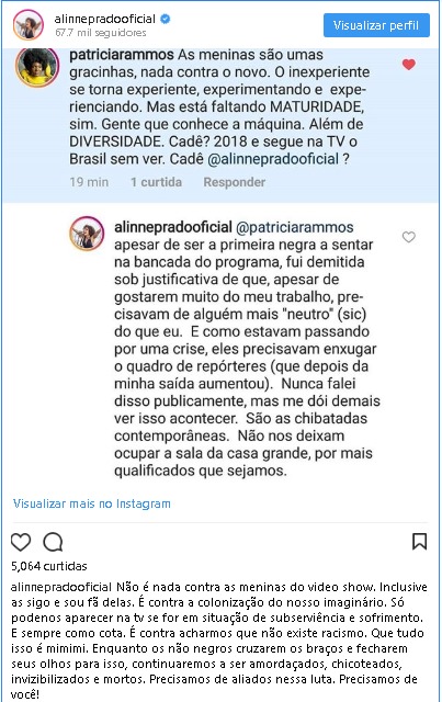 Ela também publicou o print em seu perfil e explicou que não tem nada contra as novas contratadas do Vídeo Show. “É contra a colonização do nosso imaginário”, disse. “Só podemos aparecer na TV se for em situação de subserviência e sofrimento. E sempre como cota. É contra acharmos que não existe racismo. Que tudo isso é mimimi. Enquanto os não-negros cruzarem os braços e fecharem seus olhos para isso, continuaremos a ser amordaçados, chicoteados, invizibilizados e mortos. Precisamos de aliados nessa luta. Precisamos de você!”