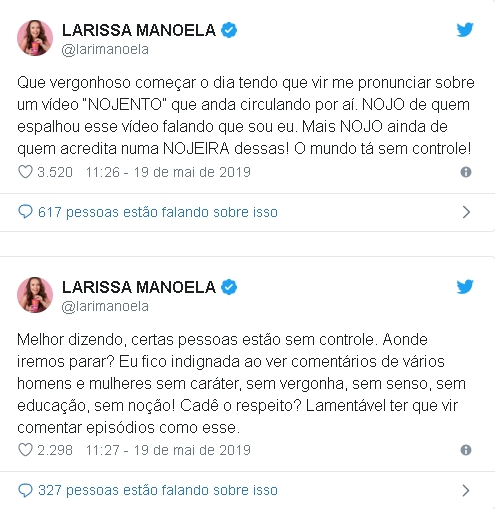 “Que vergonhoso começar o dia tendo que vir me pronunciar sobre um vídeo nojento que anda circulando por aí. Nojo de quem espalhou esse vídeo falando que sou eu. Mais nojo ainda de quem acredita numa nojeira dessas! O mundo tá sem controle!”, desabafou a estrela do SBT, de 18 anos.