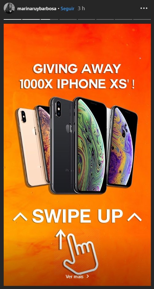 A primeira publicação ocorreu às 5h da manhã. “Doar!. Eu estou dando 1000x Iphone Xs grátis e muito mais na minha história do Instagram. Eu amo todos vocês”.