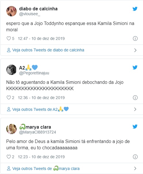 Nos comentários do vídeo, internautas de diferentes partes do país se mostram divididos em relação à treta entre as duas. Por um lado, há quem diga que Jojo merecia encontrar alguém que falasse da mesma forma que ela fala com os outros. Por outro, alguns dizem que Kamyla insiste em uma briga que não vai levar nenhuma das duas há nada. E você, o que acha?