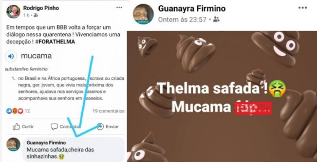 Ok, dona vice-presidente da Mangueira Guanayara Firmino. A gente já entendeu que a senhora quer a Thelma fora do 'Big Brother' e que não curte as atitudes dela. Mas isso não lhe dá o direito de chamar outra pessoa - de pele preta igual a sua, vale lembrar - de 'mucama safada' nas redes sociais. Inclusive, a coluna recebeu diversos prints que mostram todo o seu ódio para com a participante. E isso acontece não só na sua timeline do Facebook, mas também em publicações de amigos seus, como na do compositor da Mangueira Rodrigo Pinho. Ele, inclusive, postou em sua timeline uma explicação do que é o racismo...