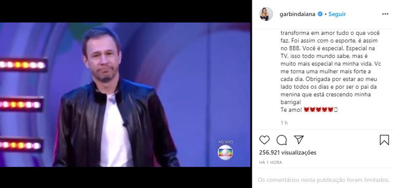 "A sua dedicação ao seu trabalho transforma em amor tudo o que você faz. Foi assim com o esporte, é assim no BBB. Você é especial. Especial na TV, isso todo mundo sabe, mas é muito mais especial na minha vida. Você me torna uma mulher mais forte a cada dia. Obrigada por estar ao meu lado todos os dias e por ser o pai da menina que está crescendo minha barriga! Te amo!", finalizou.