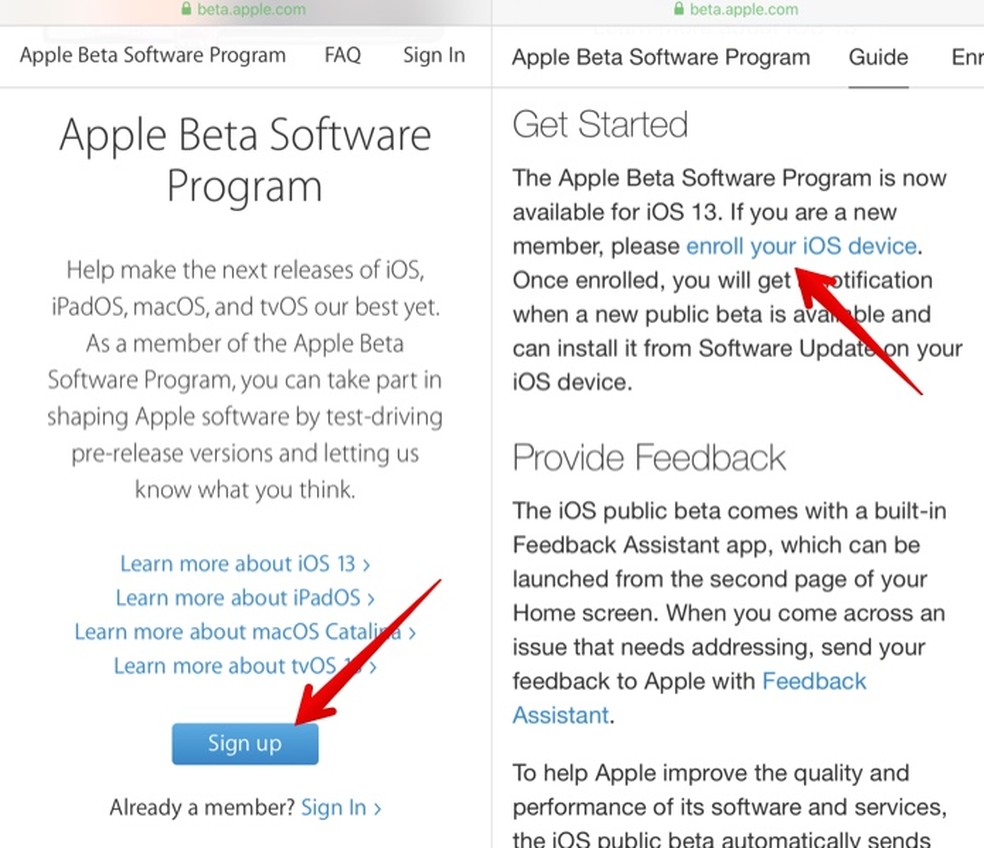 Passo 1. Acesse o site do programa de software beta da Apple (beta.apple.com) pelo seu dispositivo, toque em "Sign up" e faça login em sua conta iCloud — a mesma que você usa em seu iPhone. Em seguida, toque em "enroll your iOS Device";