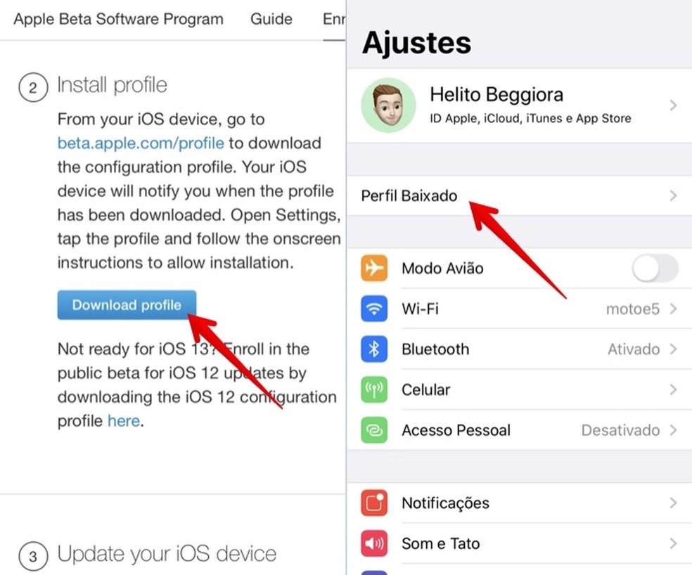 Passo 2. Agora, pressione o botão "Download profile". Uma mensagem informará que o perfil de configuração foi baixado e pode ser configurado no aplicativo de ajustes do iOS. Abra o app "Ajustes" e toque em "Perfil Baixado", na parte superior da tela de configurações;