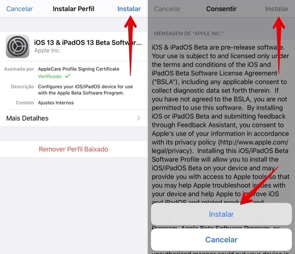 Passo 3. Depois, toque em "Instalar", no canto superior direito da tela, e digite a senha de bloqueio do seu iPhone. Toque novamente em "Instalar" e confirme a instalação tocando mais uma vez em "Instalar". Agora, reinicie o seu celular;