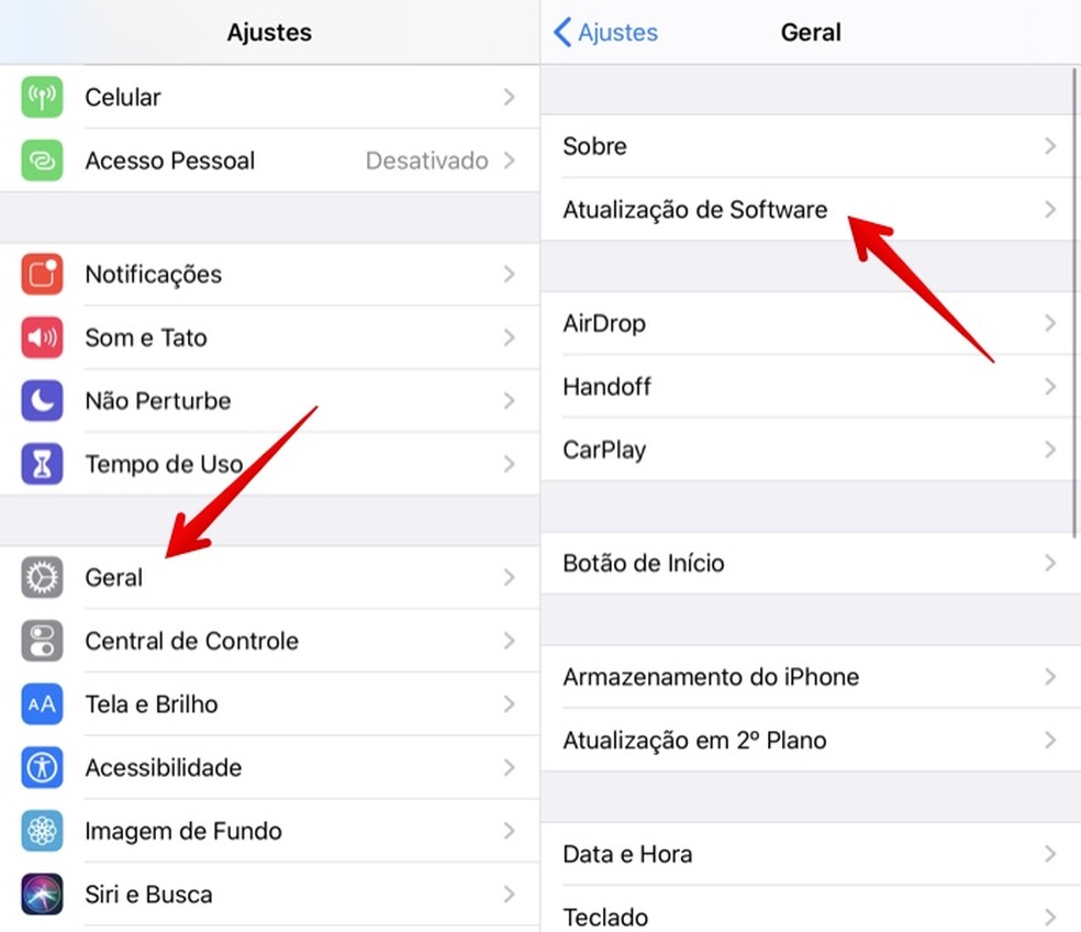 Passo 4. Após reiniciar, a atualização para o iOS 13 estará disponível para o seu aparelho. Para instalá-la, acesse as configurações, toque em "Geral" e abra "Atualização de Software". A versão Beta do iOS 13 aparecerá como uma atualização e poderá ser instalada normalmente.