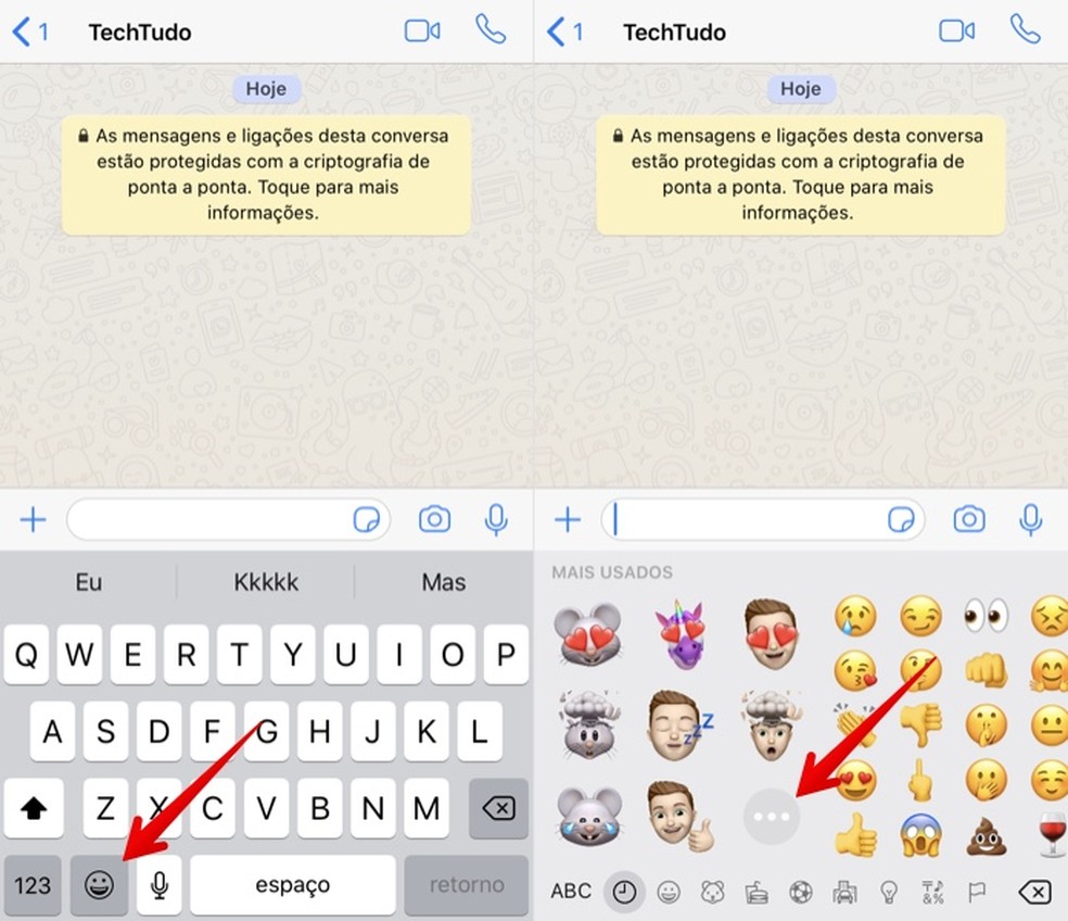 Passo 1. Caso necessário, atualize o WhatsApp. O recurso foi liberado nesta quarta-feira na última versão disponível na App Store. Feito isso, abra uma conversa no mensageiro e toque sobre o ícone de emojis, no canto inferior esquerdo do teclado. Os Memojis recentes serão exibidos à esquerda dos emojis. Toque sobre o botão "..." para ver todas as opções;