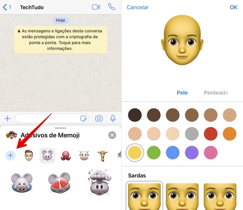 Passo 2. Você pode usar os Memojis padrão do iOS 13 ou criar uma caricatura do seu rosto. Para isso, toque sobre o botão "+" e selecione os detalhes da pele, penteado, olhos etc. Quando terminar, toque em "OK", no canto superior direito;