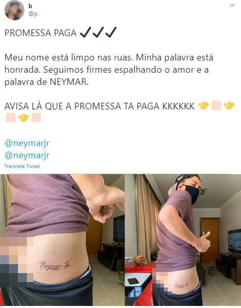 No twitter, ele divulgou a ideia. "Promessa em público. Se o PSG passar de fase e o Neymar participar diretamente de algum gol eu faço uma tatuagem na bunda escrito Neymar Júnior semana que vem. Podem me cobrar viu", publicou.