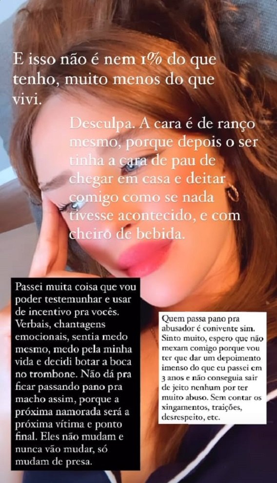 E acrescentou: "Passei muita coisa que vou poder testemunhar e usar de incentivo para vocês. Verbais, chantagens emocionais, sentia medo mesmo, medo pela minha vida e decidi botar a boca no trombone. [...] Aliás, no dia que vou postar agora, estava com crise de pânico, passando muito mal porque eu sempre era deixada enquanto as festinhas rolavam e o ser cagava pra mim e desligava o telefone pra eu não perguntar aonde estava. Dizia que era coisa de maluco ter ansiedade, depressão e pânico (o que tenho), sendo que o maior causador de tudo em mim, era o próprio".