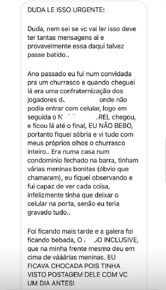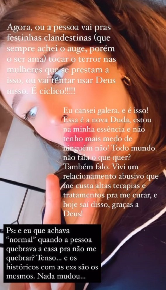 Após o vazamento de um suposto áudio que confirmaria uma traição de Nego do Borel, Duda Reis resolveu quebrar o silêncio na tarde desta terça-feira (12) e afirmou que sofreu um relacionamento abusivo com o funkeiro.