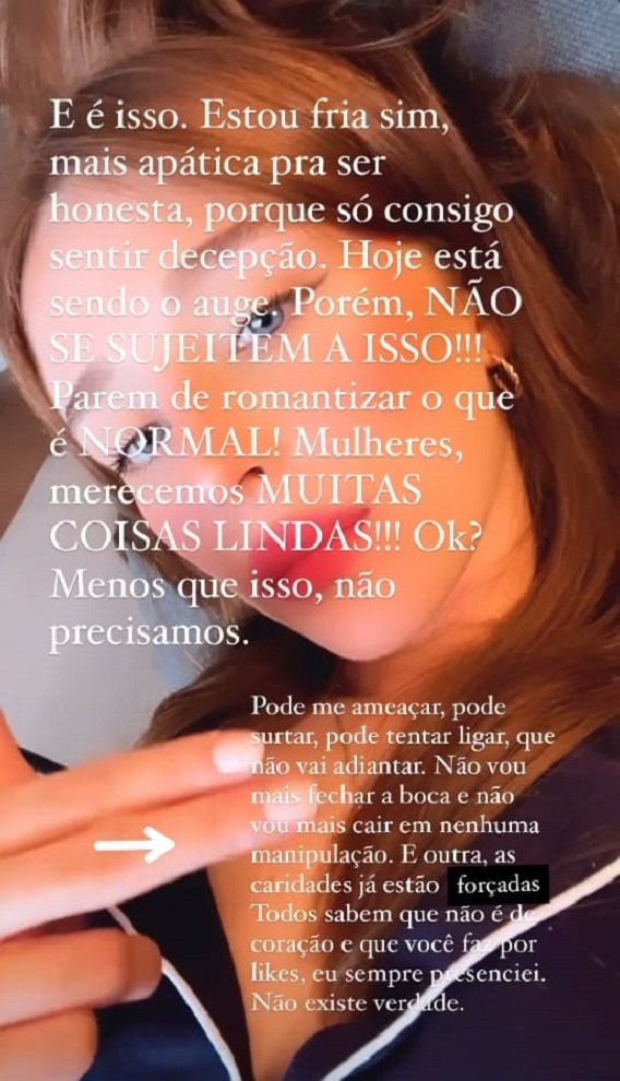 Mais tarde, também pelos stories, a atriz caiu no choro após receber outros indícios de traições, além de afirmar temer pela própria segurança. "Pessoas falando de situações que eu chegava a desconfiar, mas eu era sempre tratada como maluca. Pessoas que participavam dessas safadezas dando risada de mim, que coisa horrível! Isso é muito desumano! [...] Vou tomar todas as medidas protetivas necessárias, porque preciso, temo pela minha vida e temo pela minha segurança, sim. Sei como a pessoa é. Não sou louca, não sou mentirosa. Sei o que vivi, eu sei o medo que dá", afirmou.