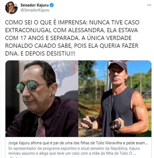 Em seu Twitter, Kajuru ainda disse que se envolveu com Alessandra, mãe de Marcela. "Nunca tive caso extraconjugal com Alessandra. Ela estava com 17 anos e separada. A única verdade Ronaldo Caiado sabe, pois ela queria fazer DNA e depois desistiu!!!".