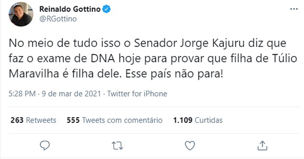 "No meio de tudo isso o Senador Jorge Kajuru diz que faz o exame de DNA hoje para provar que filha de Túlio Maravilha é filha dele. Esse país não para!", escreveu Gottino.