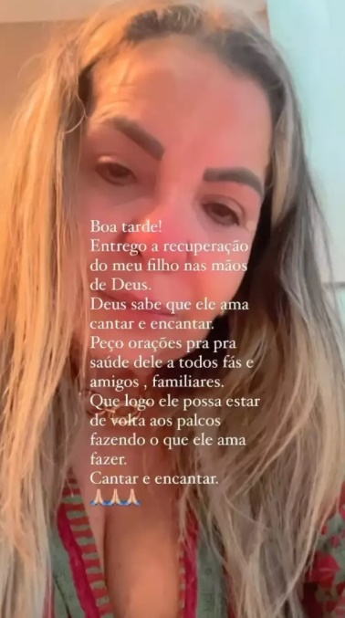 "Boa tarde. Entrego a recuperação do meu filho nas mãos de Deus. Deus sabe que ele ama cantar e encantar. Peço oração para a saúde dele a todos os fãs, amigos e familiares", escreveu ela na legenda do vídeo em que aparece chorando.