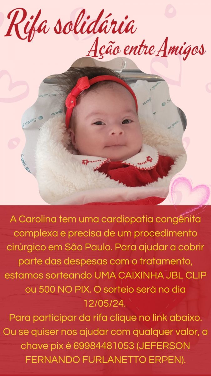 Diante dos desafios e das despesas do tratamento, os pais de Carolina, em um gesto de amor, estão mobilizando a comunidade em uma comovente rifa solidária. O objetivo é angariar fundos para cobrir metade dos custos do tratamento.