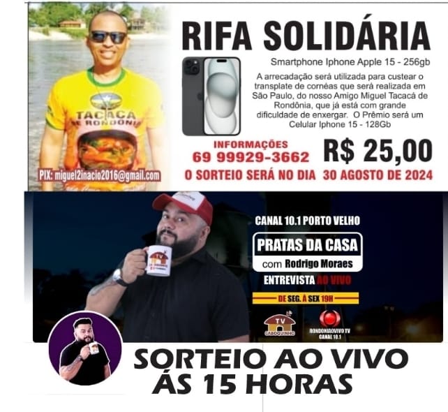 No próximo dia 30 de agosto, um evento solidário ganhará destaque em Porto Velho. Trata-se do sorteio de um iPhone 15, 256GB, em prol do transplante de córnea do Miguel Inácio, carinhosamente conhecido como Miguel do Tacacá de Rondônia.