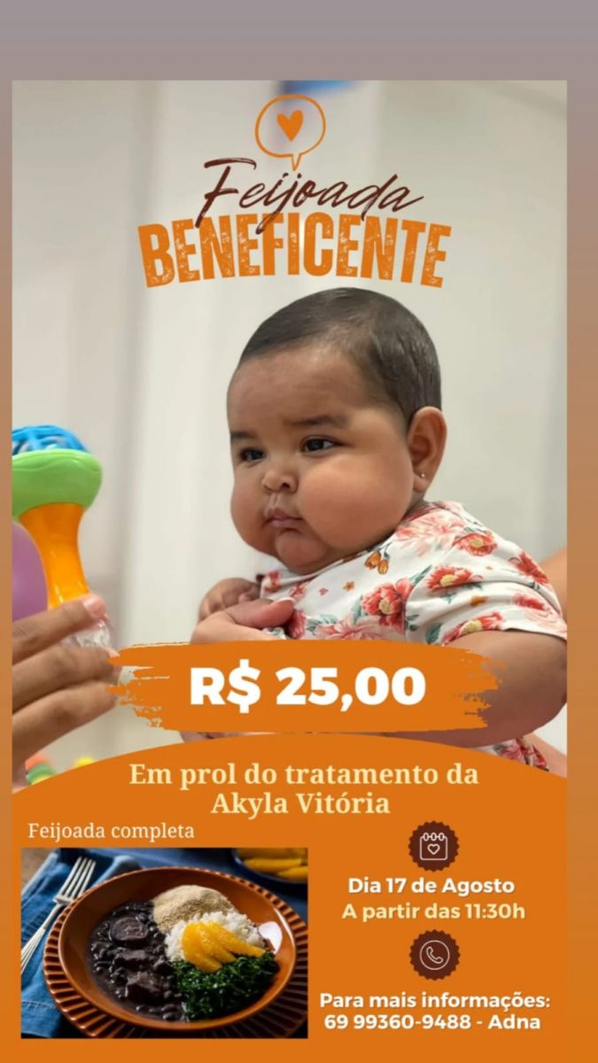 Os pais da pequena Akyla Vitória, de 7 meses, residentes no bairro Nova Esperança, em Porto Velho, estão organizando uma feijoada solidária para arrecadar fundos destinados à saúde da filha. Akyla precisa realizar exames importantes para o fechamento de um diagnóstico médico.