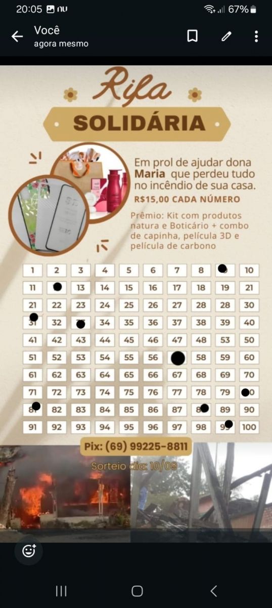 Como forma de ajudá-la, a família está organizando uma rifa para arrecadar dinheiro para a reconstrução da casa. Cada número custa R$ 15,00 e os participantes concorrerão a um kit com produtos da Natura e Boticário, além de um combo com capinha, película 3D e película de carbono para celular.