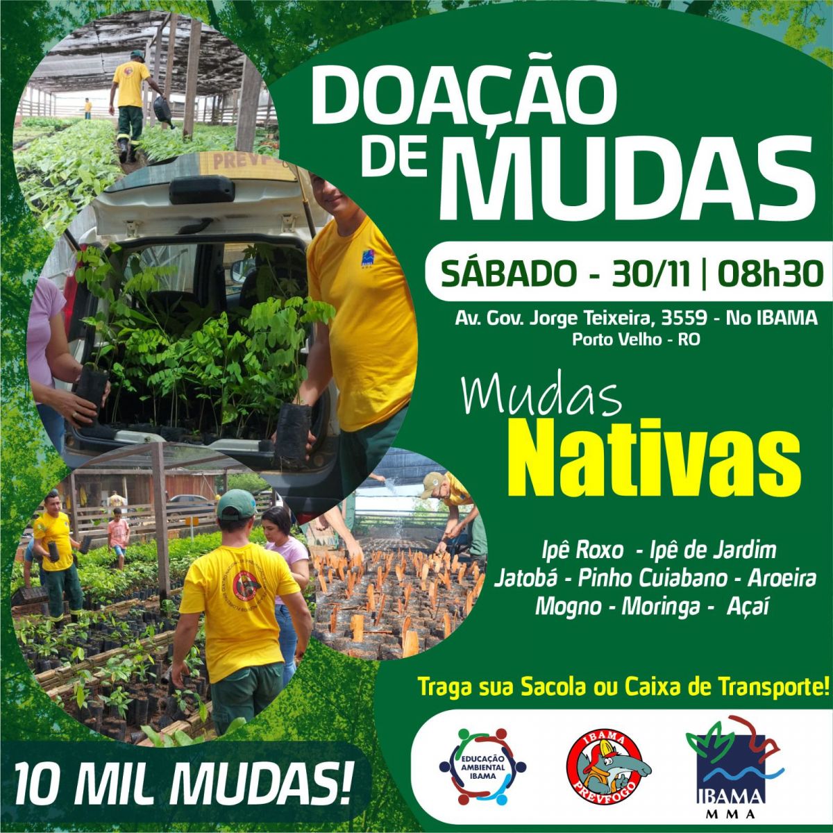 O Instituto Brasileiro de Meio Ambiente e Recursos Naturais Renováveis - Ibama, realiza neste sábado mais uma doação de mudas de essências nativas. Dando continuidade ao sucesso da primeira ação, os brigadistas do PrevFogo colocam à disposição dos moradores de Porto Velho cerca de 10 mil mudas, que irão colaborar no fortalecimento do meio ambiente.