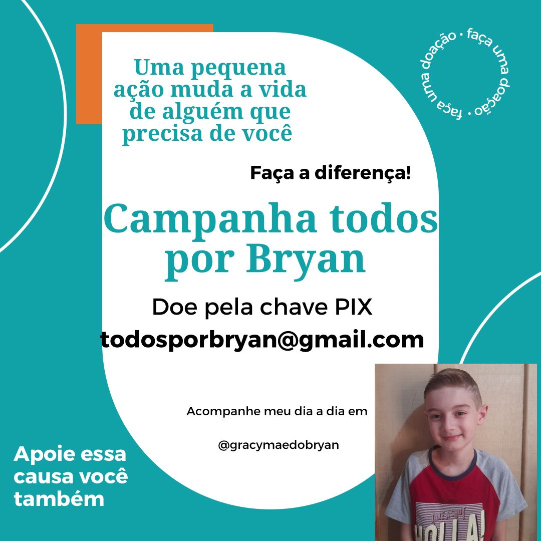 vaquinha online, as doações podem ser feitas via Pix, utilizando a chave todospobryan@gmail.com. A luta de Graciely é não apenas por um tratamento, mas por mais tempo e qualidade de vida para Bryan, cuja expectativa de vida, segundo especialistas, varia entre 20 e 30 anos.