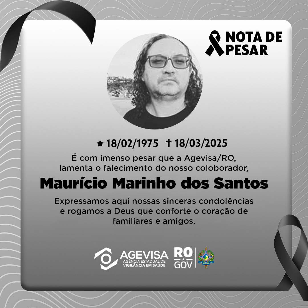 Informamos com pesar o falecimento de Maurício Marinho dos Santos, servidor da Agência Estadual de Vigilância em Saúde de Rondônia (Agevisa), ocorrido às 17h20 desta tarde de terça-feira (18/03), em Porto Velho. Ele passava por tratamento intensivo de saúde e não resistiu.