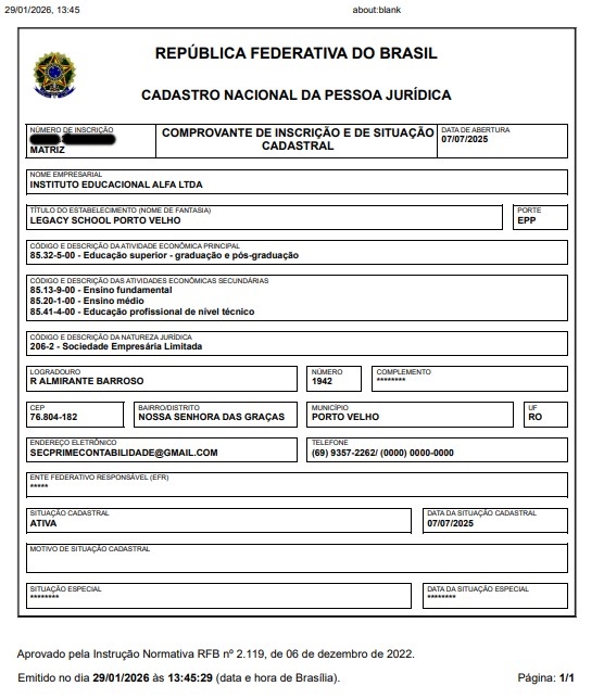 A documentação mostra um cenário ainda mais grave em relação ao colégio. O Legacy não possui autorização para funcionamento como escola em nenhum segmento educacional. Apesar disso, a instituição divulga vagas, oferta ensino e realiza matrículas, inclusive para a Educação Infantil, operando à margem da legislação e induzindo famílias ao erro.