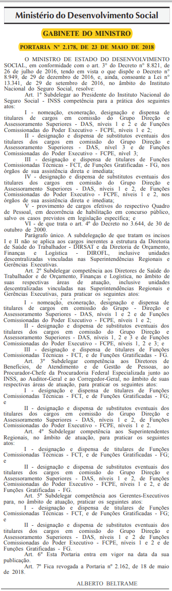 Excelente notícia para os candidatos que aguardam nomeações e esperam o próximo concurso público do Instituto Nacional do Seguro Social (Concurso INSS 2018). Acontece que foi divulgado no Diário Oficial da União desta quinta-feira, 24 de maio, a portaria que autoriza o presidente do órgão a prover diversos atos dentro do respectivo Quadro de Pessoal. Dentre elas, está o provimento de cargos efetivos em decorrência de habilitação em concurso público. O documento foi assinado por Alberto Beltrame (veja abaixo).