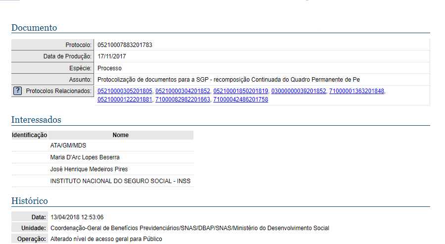 O último avanço do pedido de concurso INSS aconteceu no dia 13 de abril. De acordo com o protocolo integrado do Governo Federal (veja abaixo), a qual o Notícias Concursos teve acesso, a solicitação foi alterada de nível de acesso geral para público na Coordenação-Geral de Benefícios Previdenciários/SNAS/DBAP/SNAS/Ministério do Desenvolvimento Social do Planejamento.
