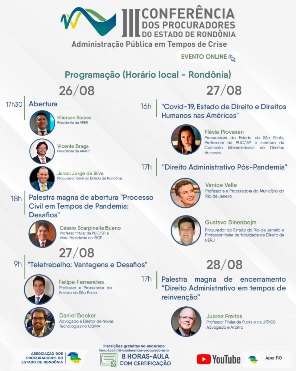 Com o tema “Administração Pública em Tempos de Crise”, a III Conferência dos Procuradores do Estado de Rondônia será realizada entre os dias 26 a 28 de agosto, desta vez de forma online, por meio do canal do Youtube da Associação dos Procuradores de Rondônia (Aper). As inscrições estão abertas e podem ser realizadas por meio da plataforma Sympla. Ao final do evento, será emitido uma certificação de 8 horas por aula.
