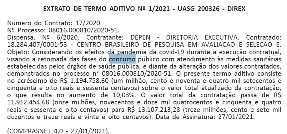O Departamento Penitenciário Nacional (Depen), órgão pertencente ao Ministério da Justiça e Segurança Pública, publicou, nesta segunda-feira (1/2) um termo aditivo ao contrato com o Cebraspe.